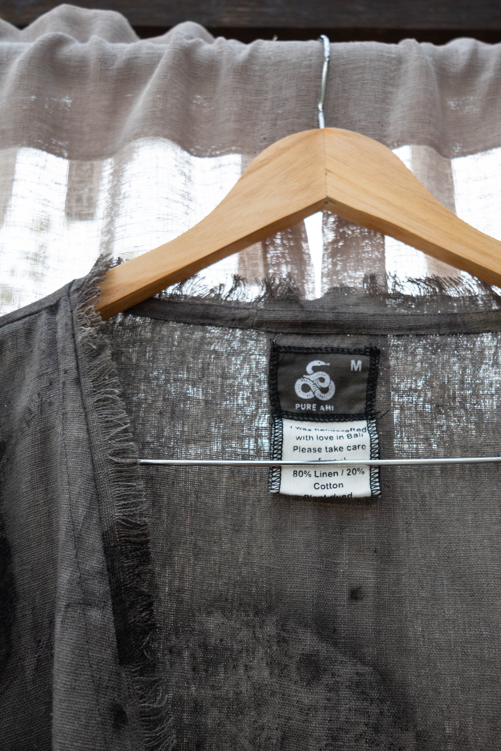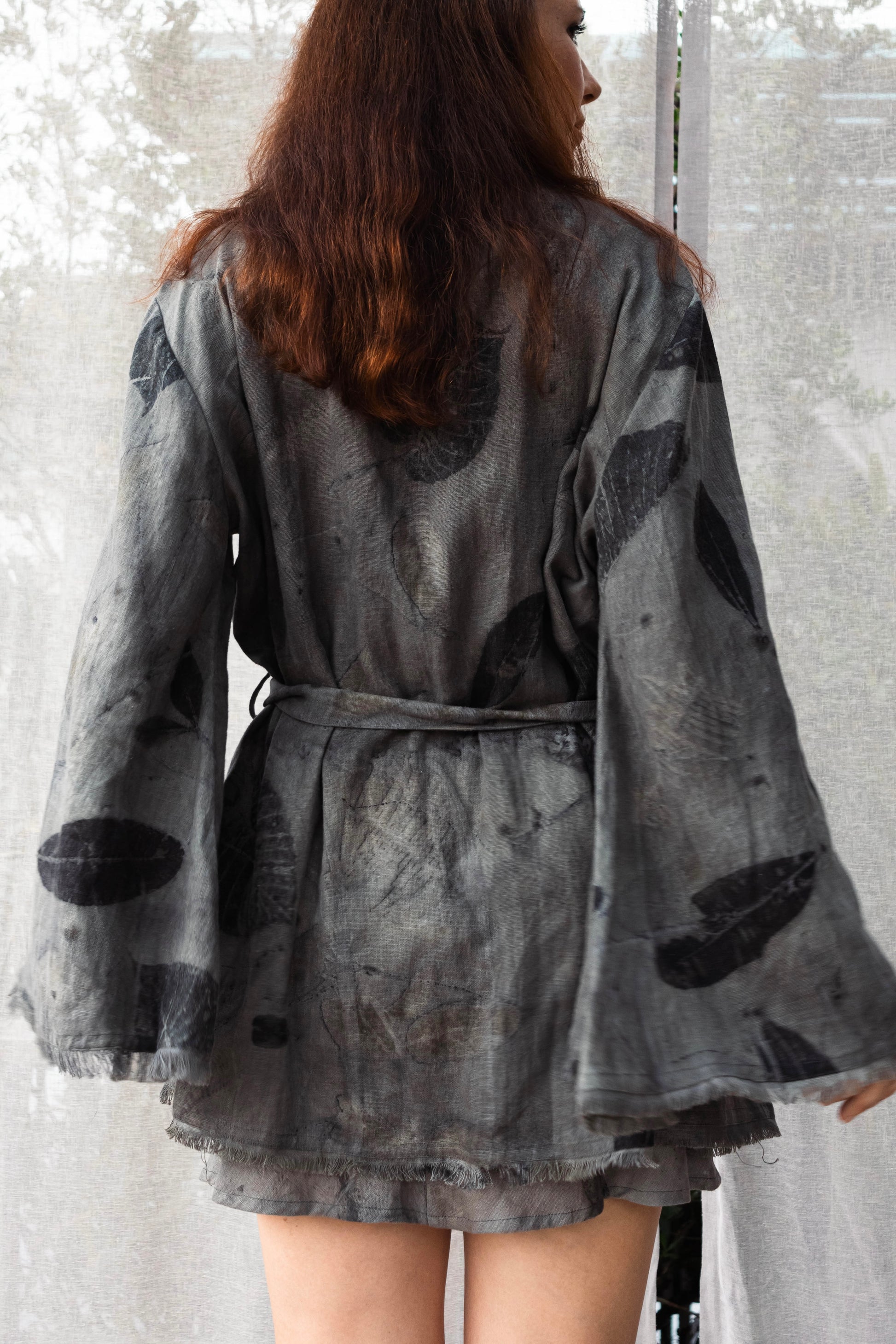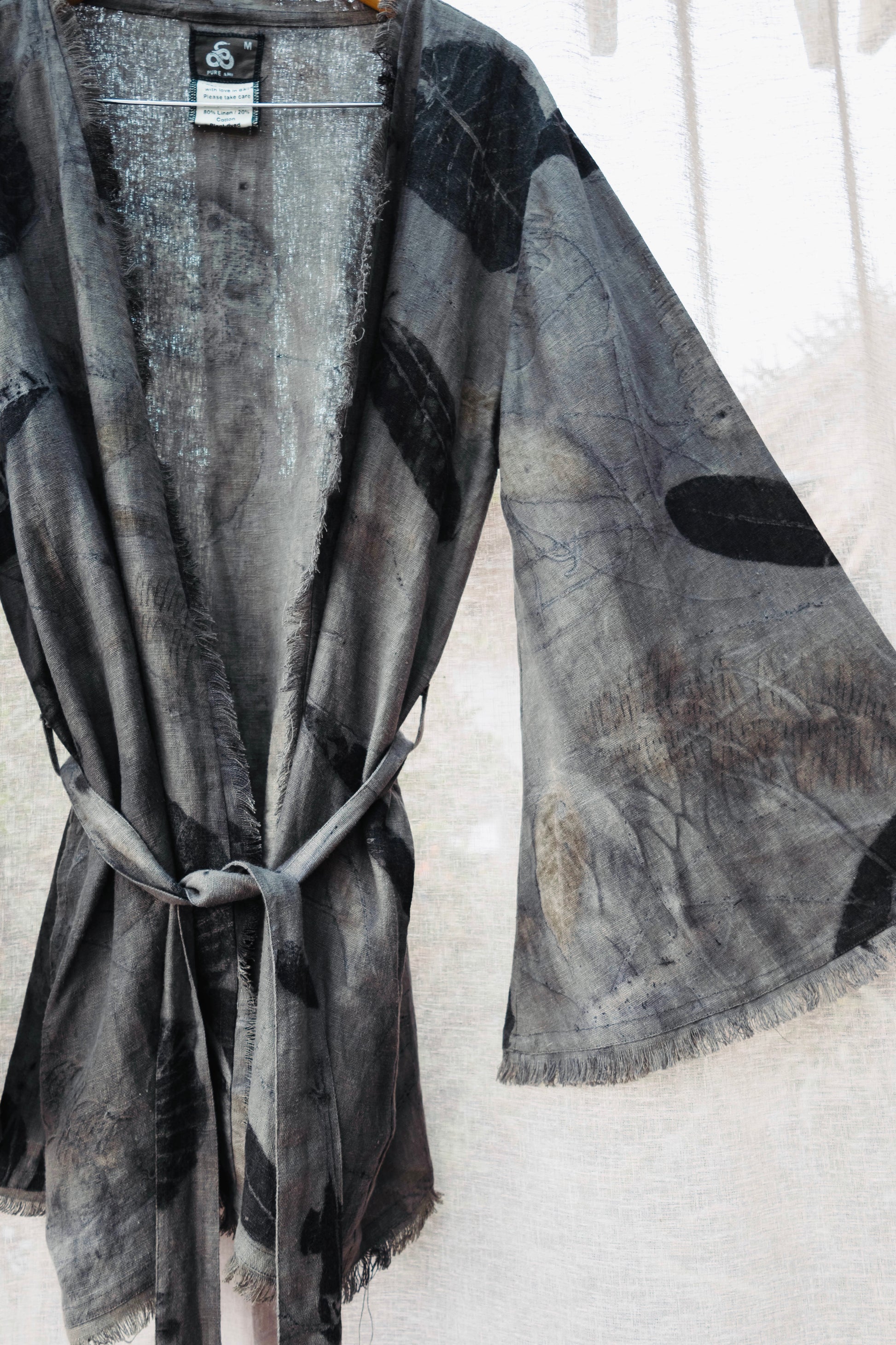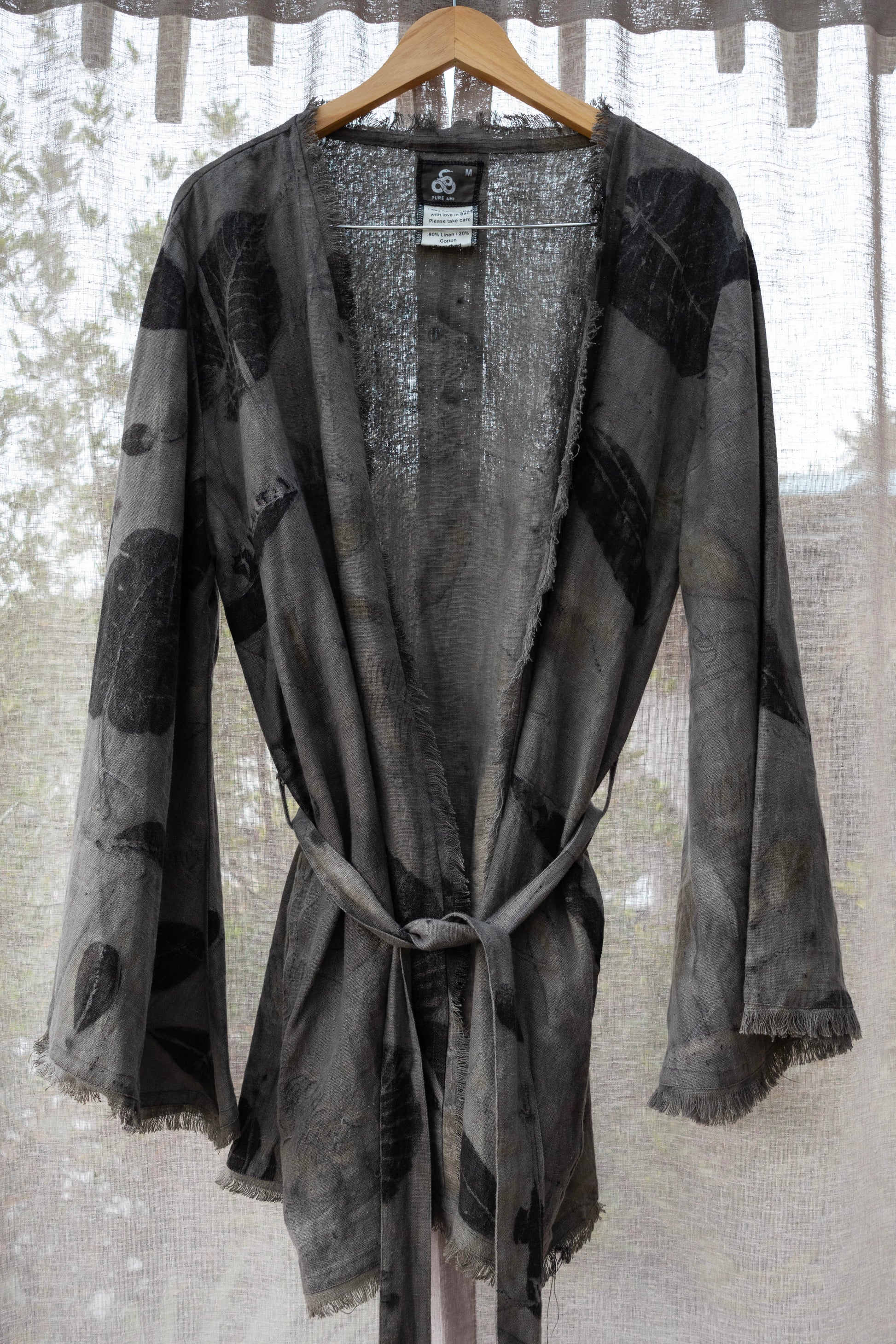 Our Earth Muse Kimono is flowing and timeless. Crafted from a breathable linen-cotton blend and hand eco-printed with real leaves, each kimono carries its own naturally unique pattern.