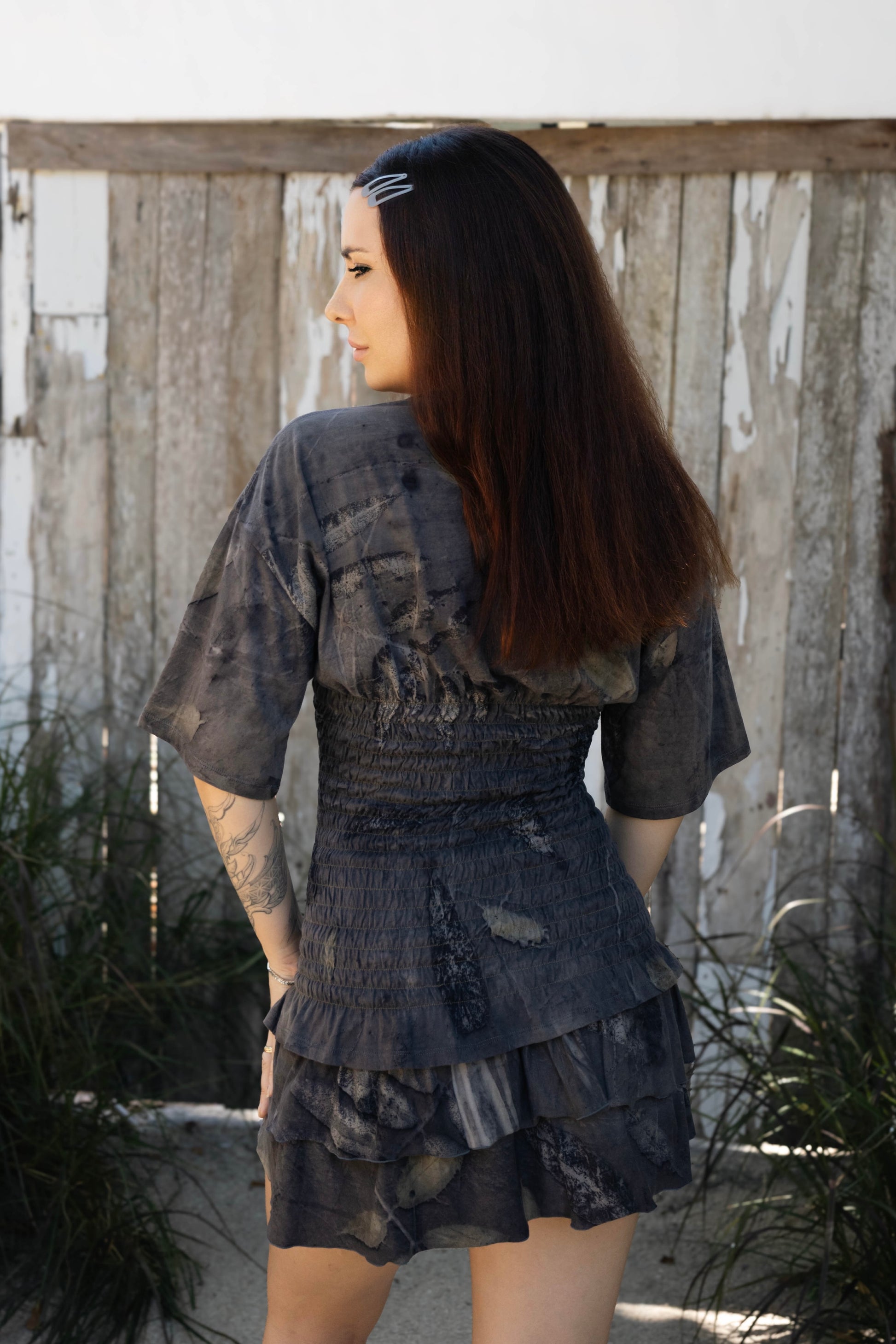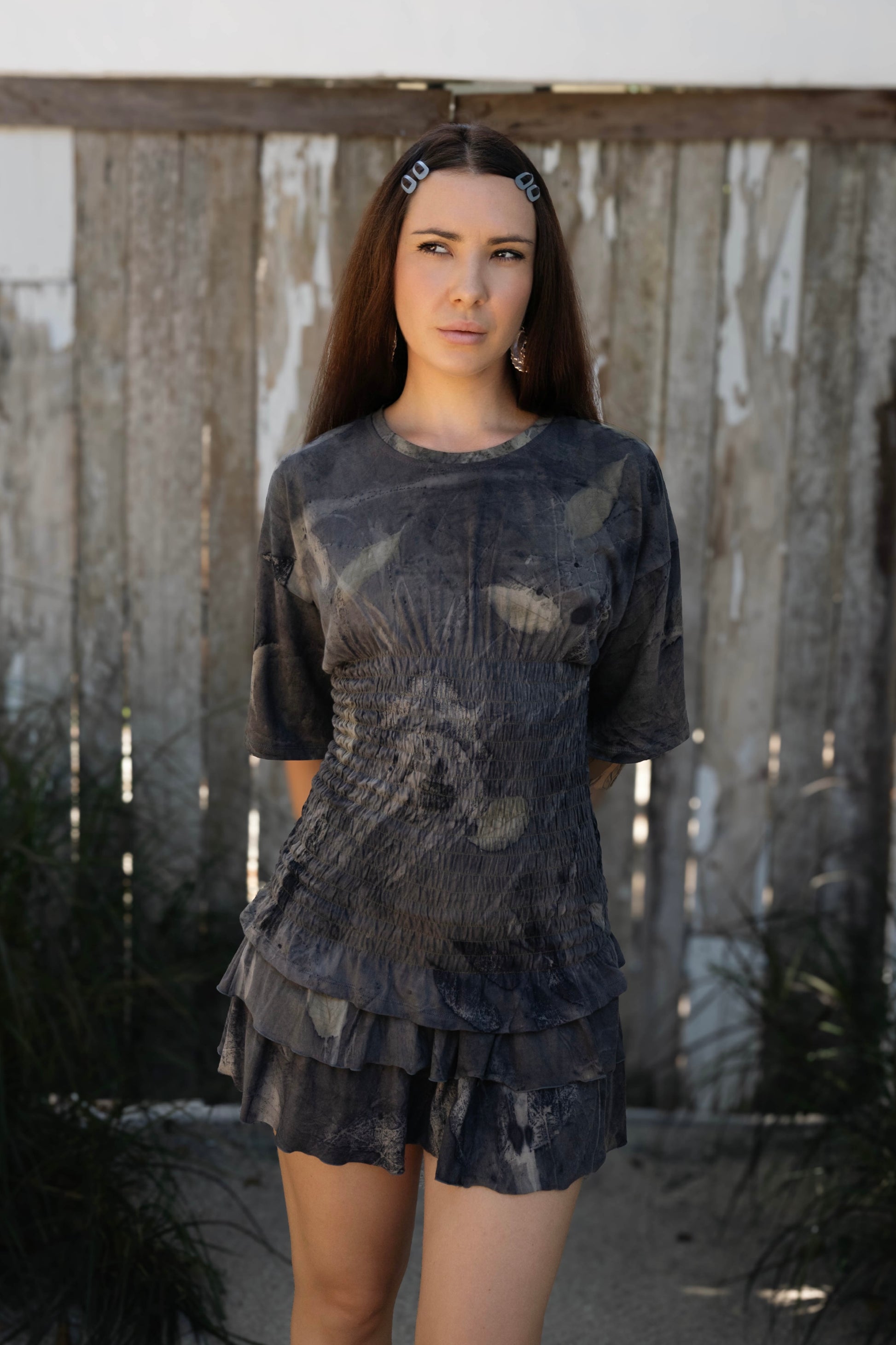 The Elira blends the ease of a boyfriend tee with a touch of feminine tailoring. Crafted from 100% organic cotton and eco-printed with real leaves, every t-shirt is special. Elira is perfect for pairing with our Lila mini skirt, Isha maxi skirt, or Sol Resort pants.