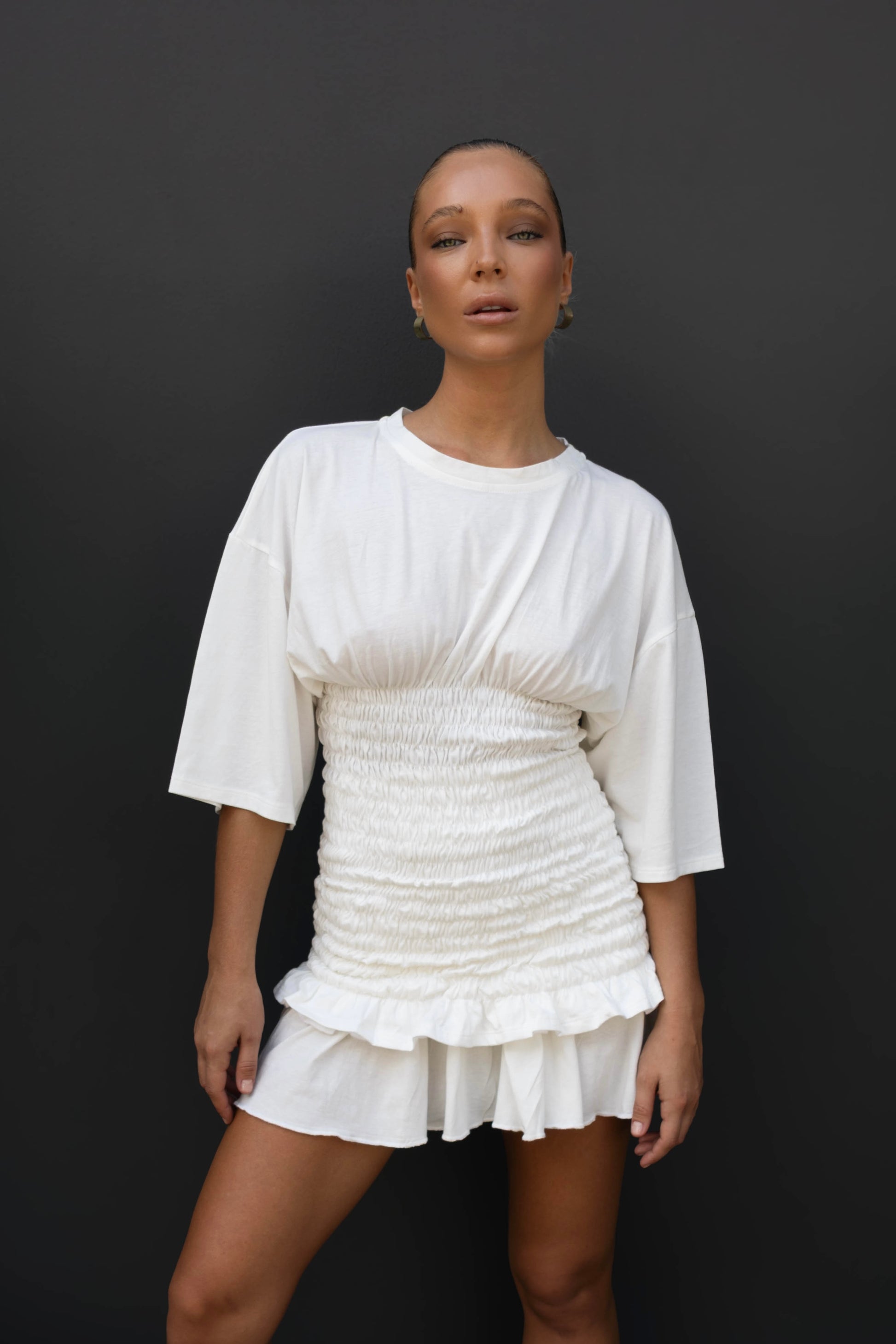 The Elira in pure white is a timeless take on our favourite feminine-boyfriend blend. Crafted from 100% organic cotton with a soft yet durable hand feel, this version is free from dyes for an elegant finish. Elira in white pairs effortlessly with our Lila mini skirt in white.
