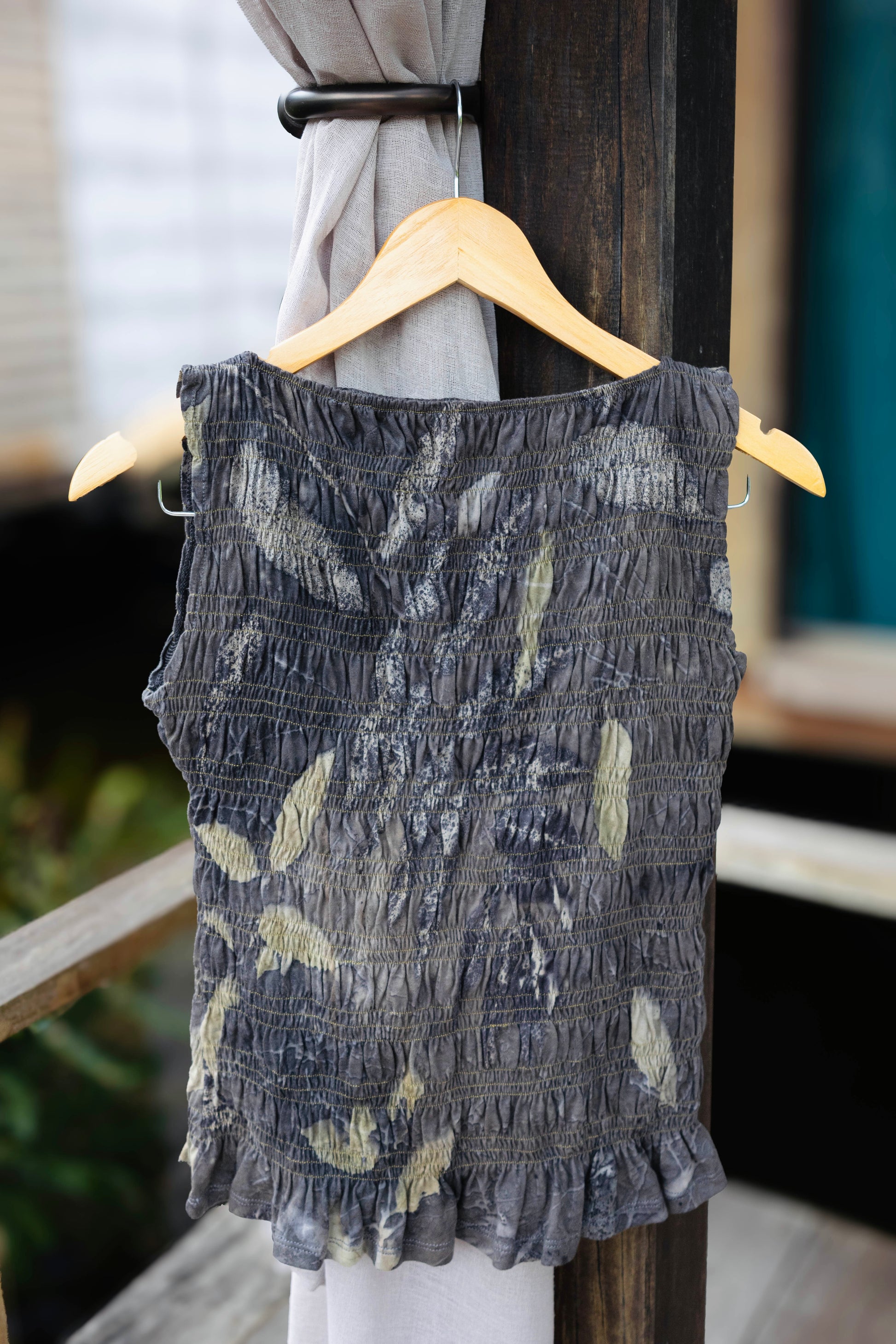 All of our dyeing for this collection is done by a family business in rural Java. Each morning, the father ventures into the jungle near their village, often followed by his children, to gather the leaves and plants needed for that day's eco-printing. Each day, the family transforms around five pieces of fabric into botanical art, each print unique.