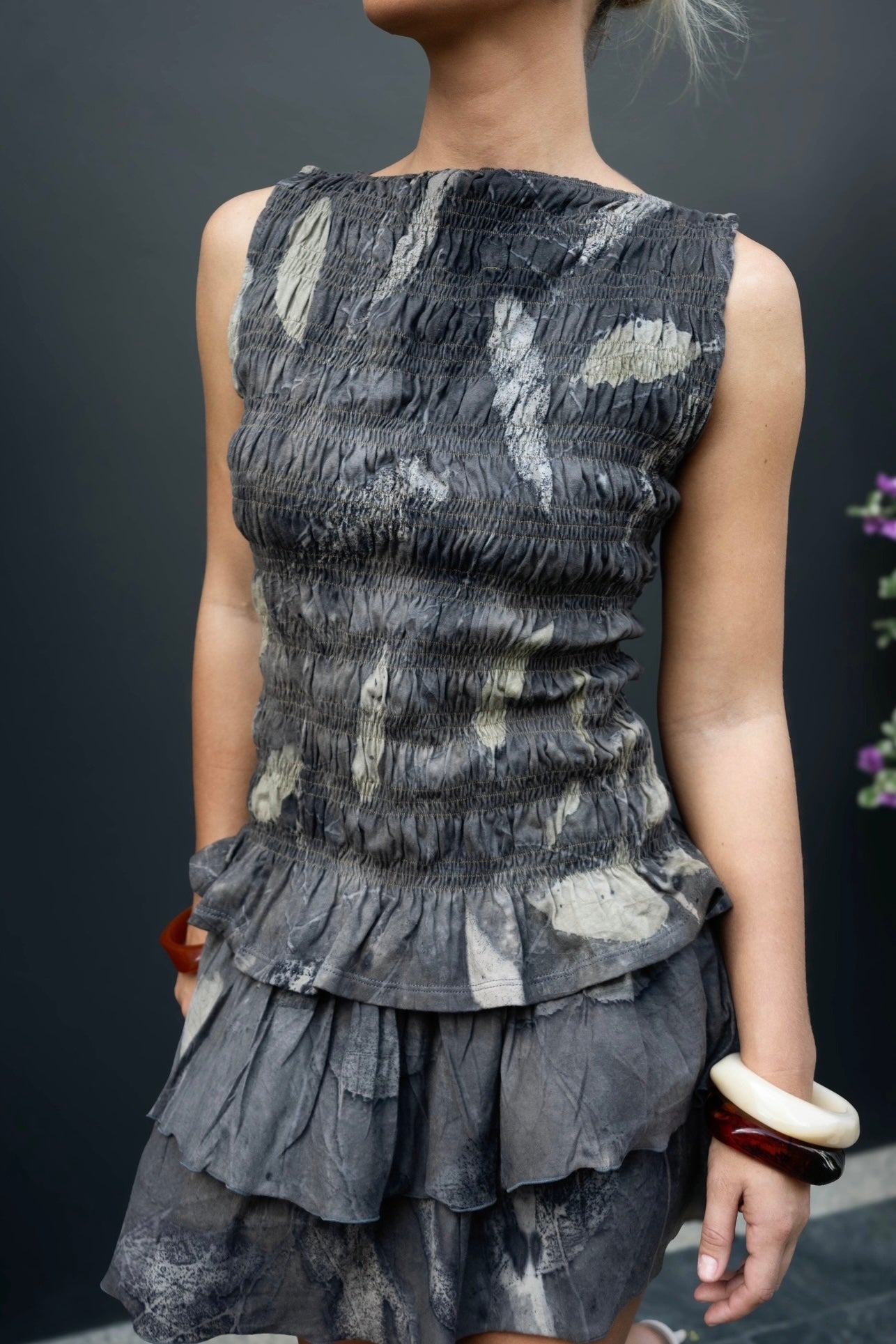 The Nara top is an effortless style with a statement edge. Crafted from 100% organic cotton and eco-printed with real leaves, every top carries its own natural variations, making each one uniquely yours. The top goes well with our Lila mini skirt, Isha maxi skirt, Sol Resort pants or Mira linen/cotton wide pants.