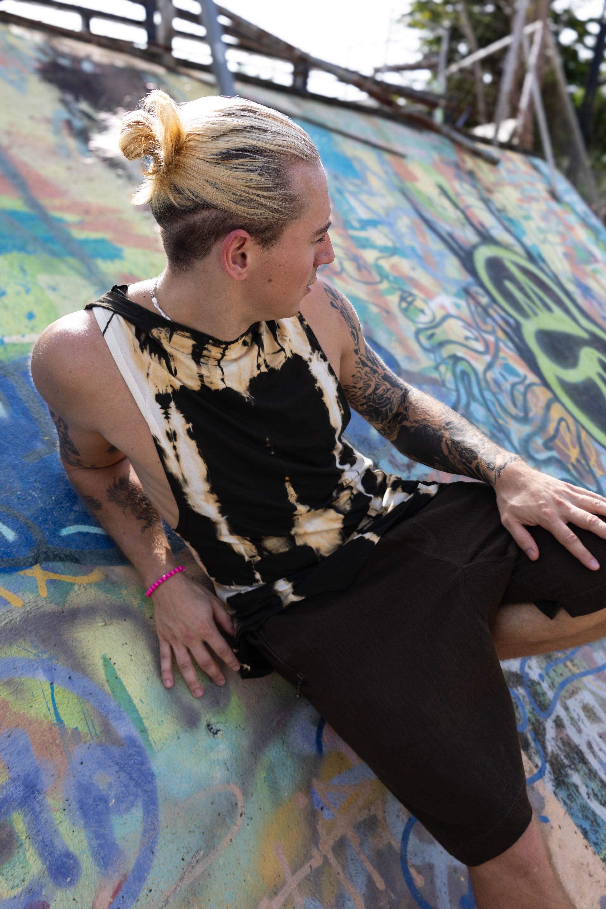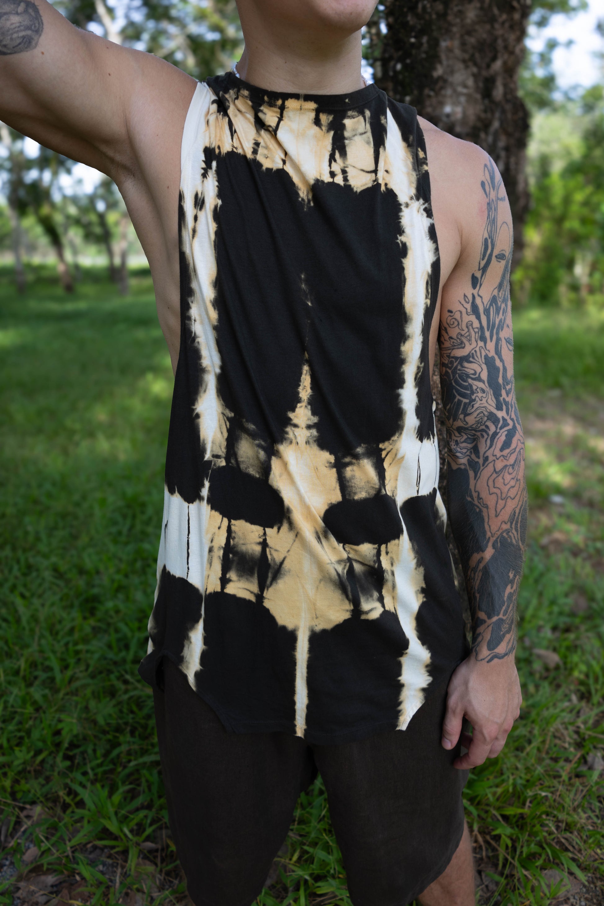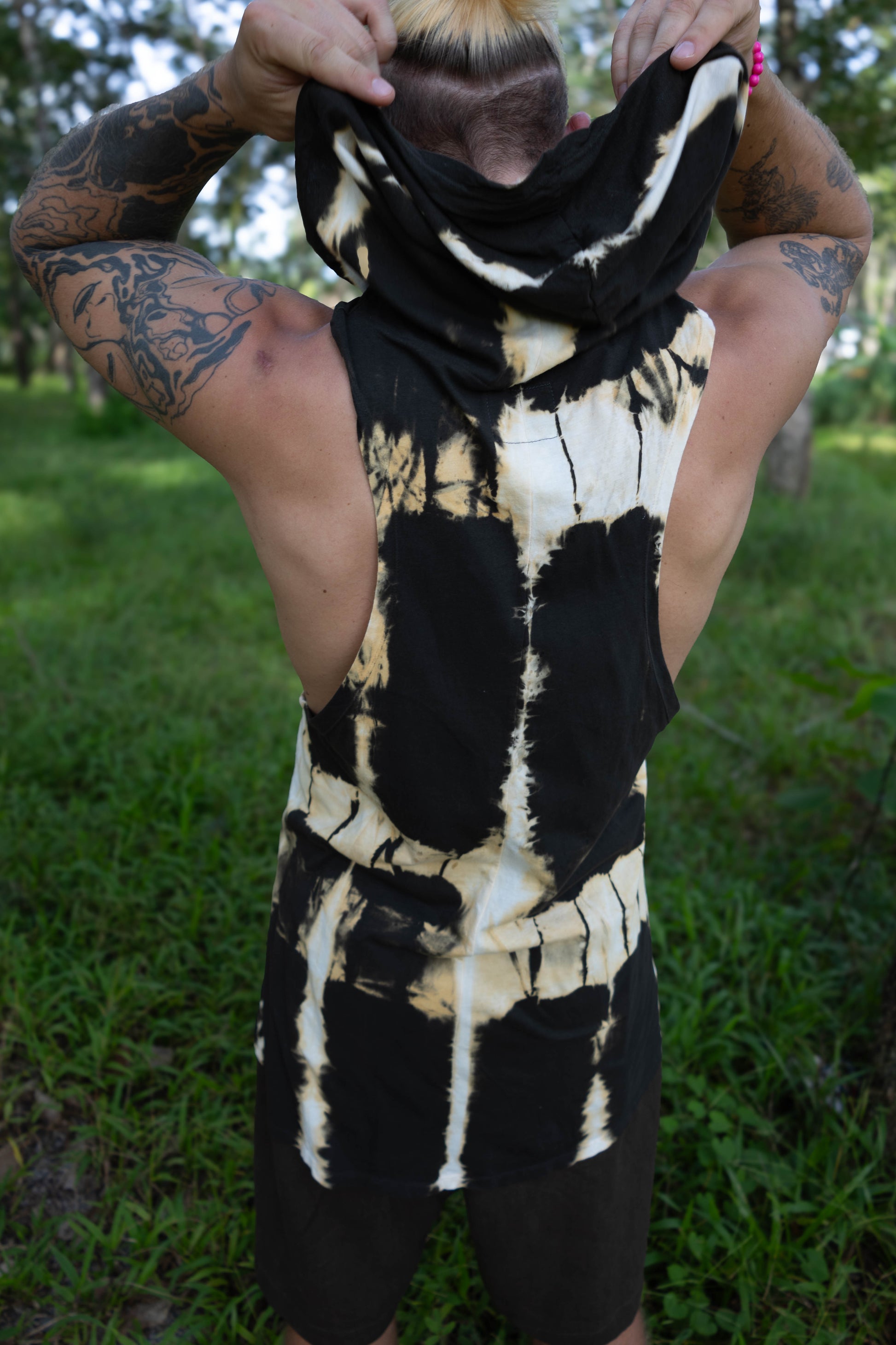 The Nomad Hood Tank is crafted from 100% GOTS-certified organic cotton and naturally plant-dyed into bold black and golden tones. It carries both strength and intention.