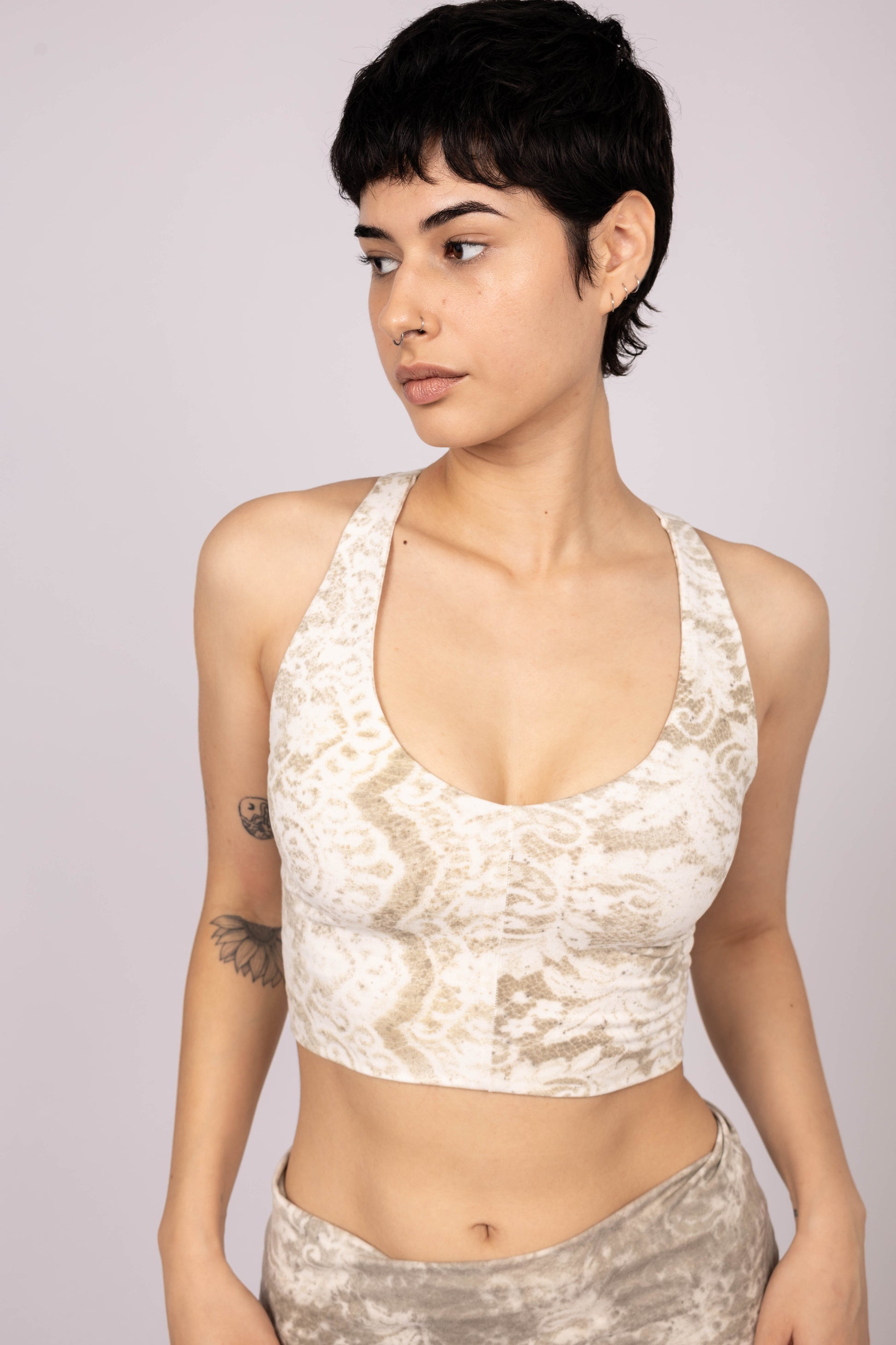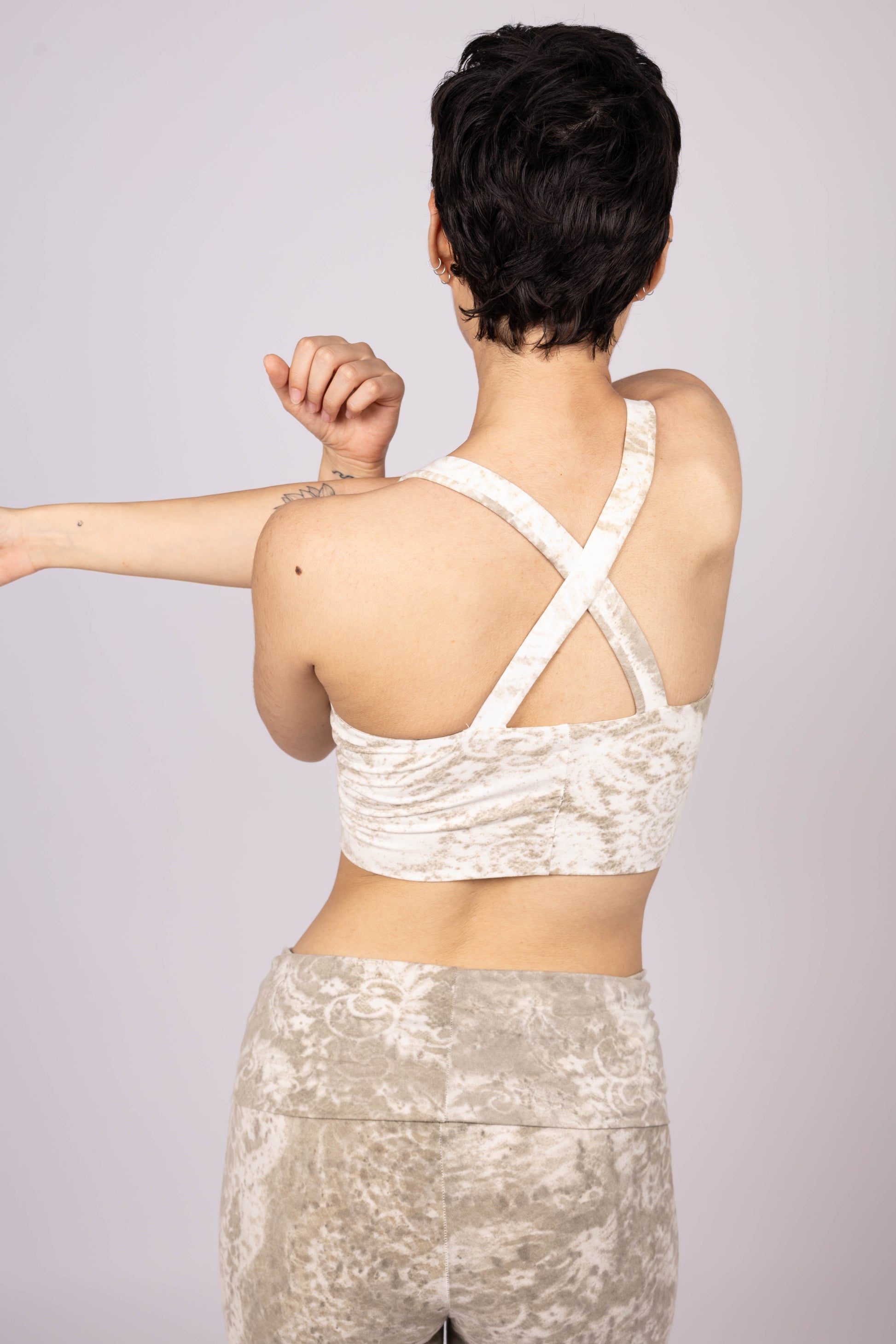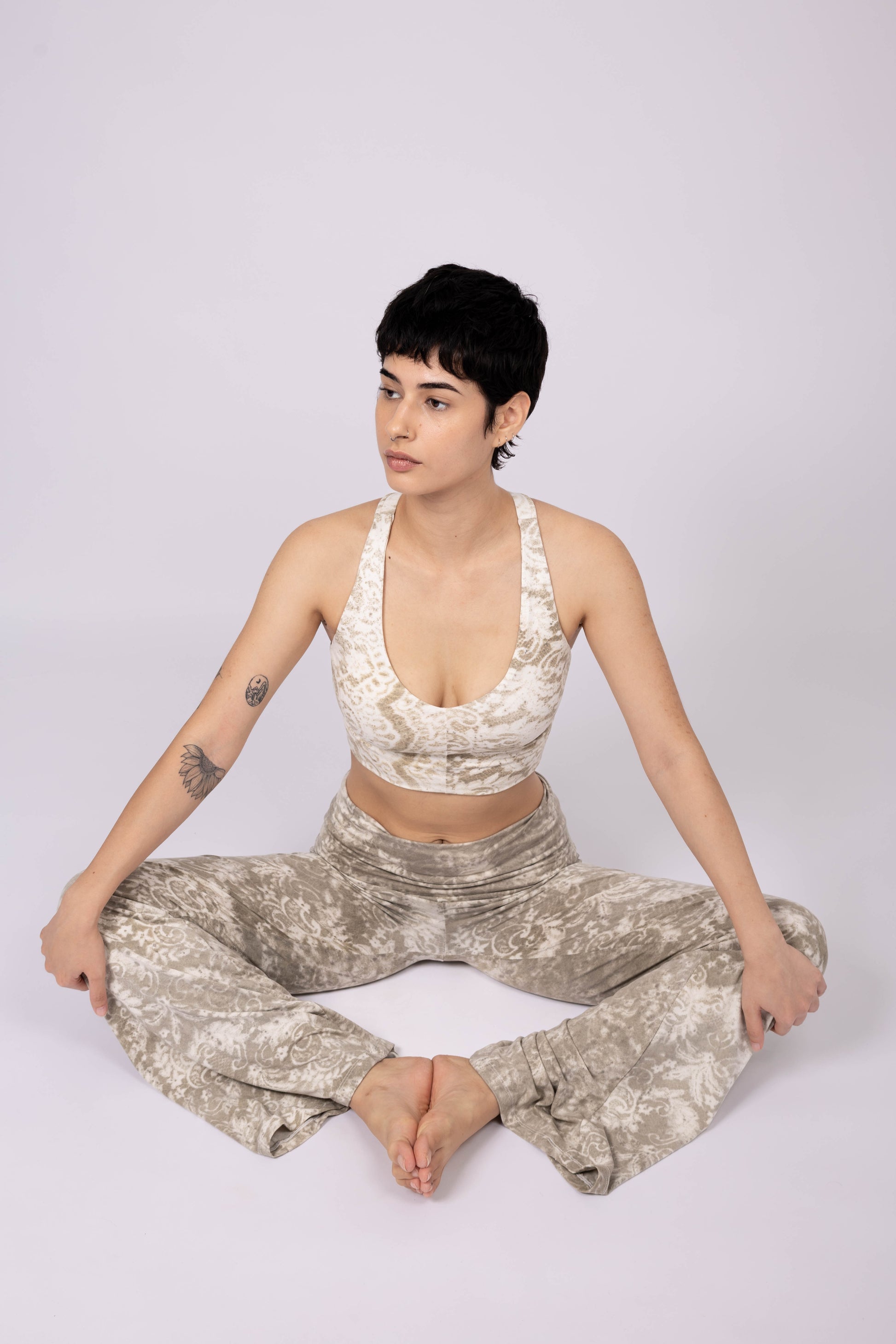 The fitted crop top features wide straps and a beautiful crisscross back design for comfort and support, while the high-rise flared pants offer freedom of movement and a flattering silhouette. It's plant-dyed by hand, using a rare technique in which lace is sprayed with natural pigment to leave behind a delicate imprint.