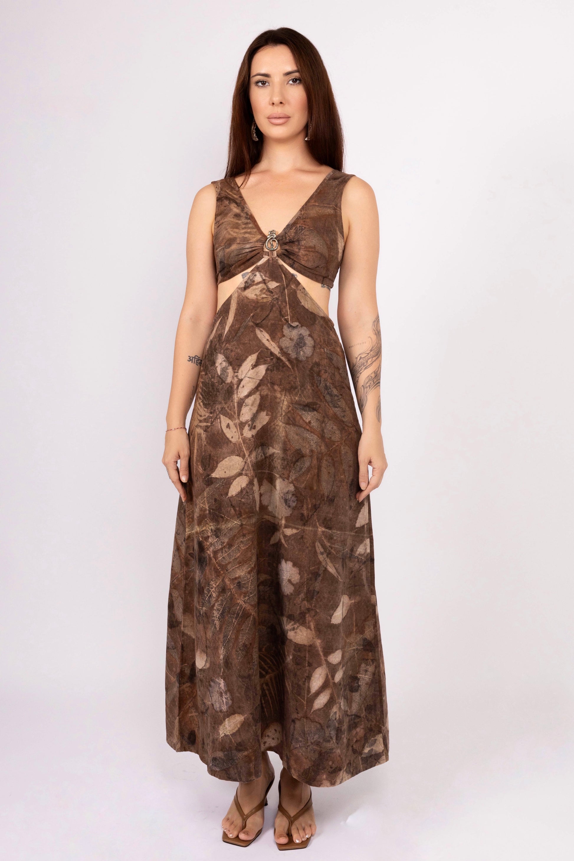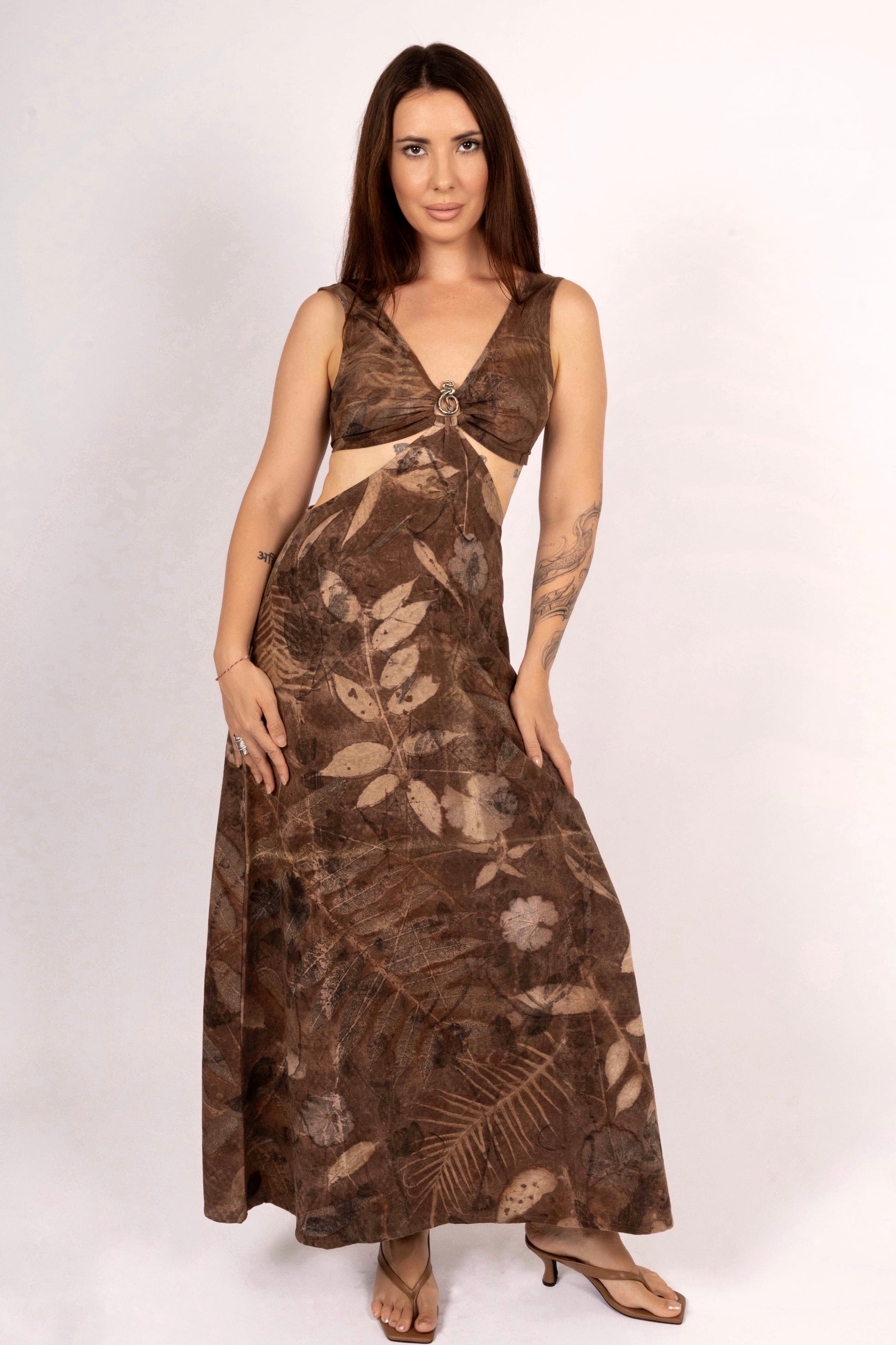 Crafted for the earth-connected woman, the Ahi dress is a one-of-a-kind piece made from a structured ramie-cotton blend, thicker and more sculptural than our bamboo satin version. Each dress is hand-dyed using the ancient eco-print technique, where real leaves are pressed onto the fabric in rural Indonesia, resulting in a rich botanical tapestry. No two dresses are ever the same.
