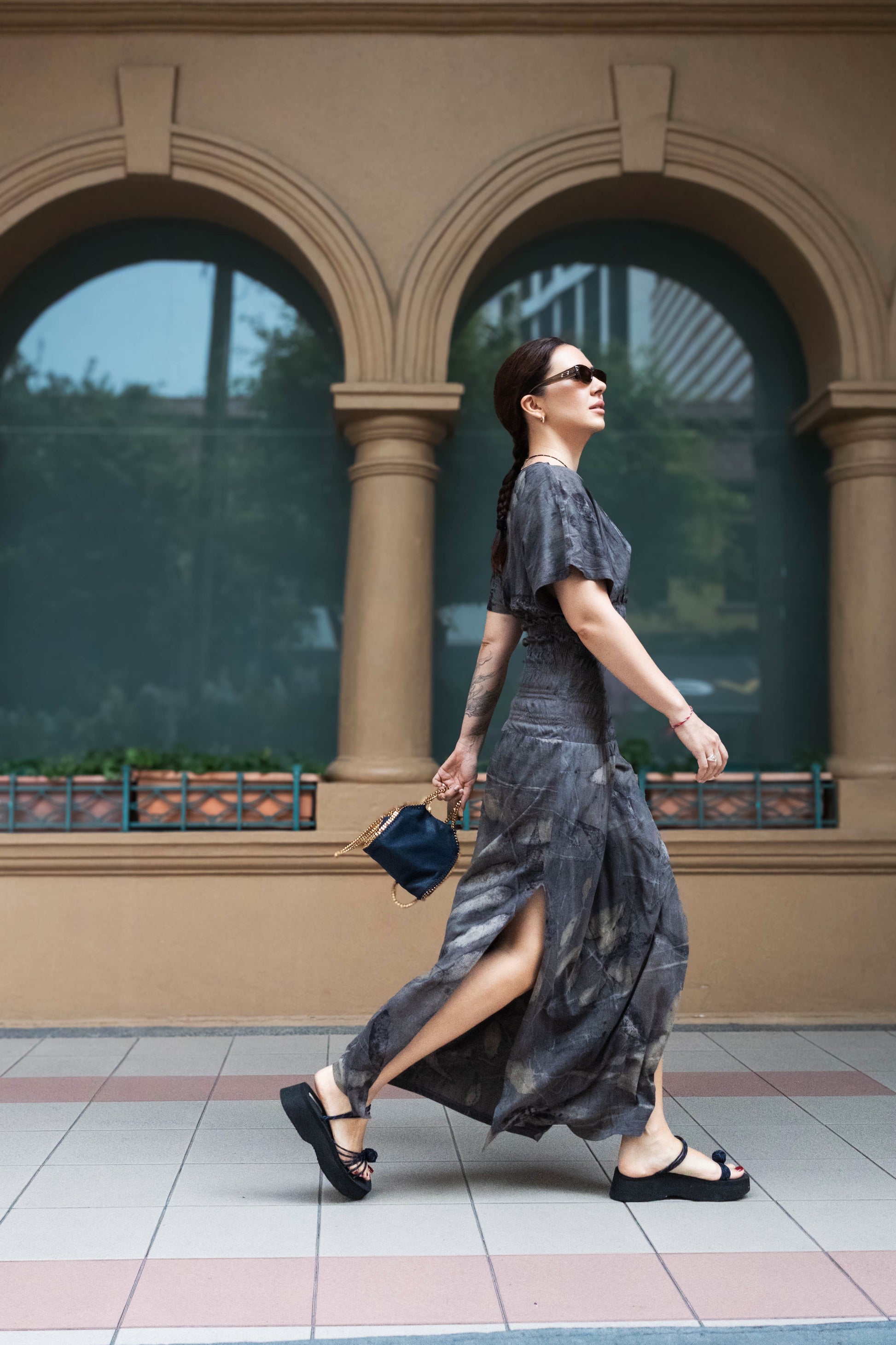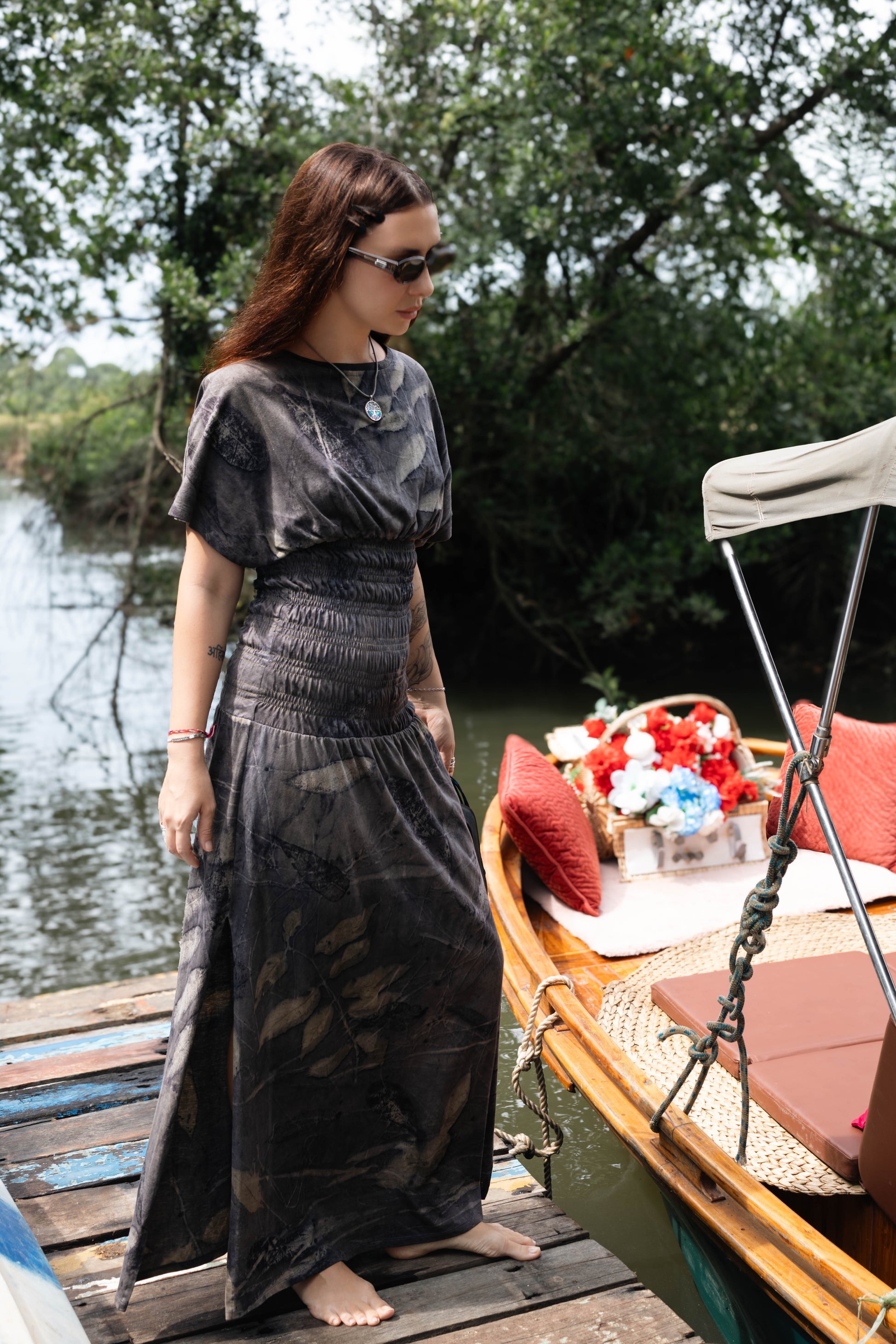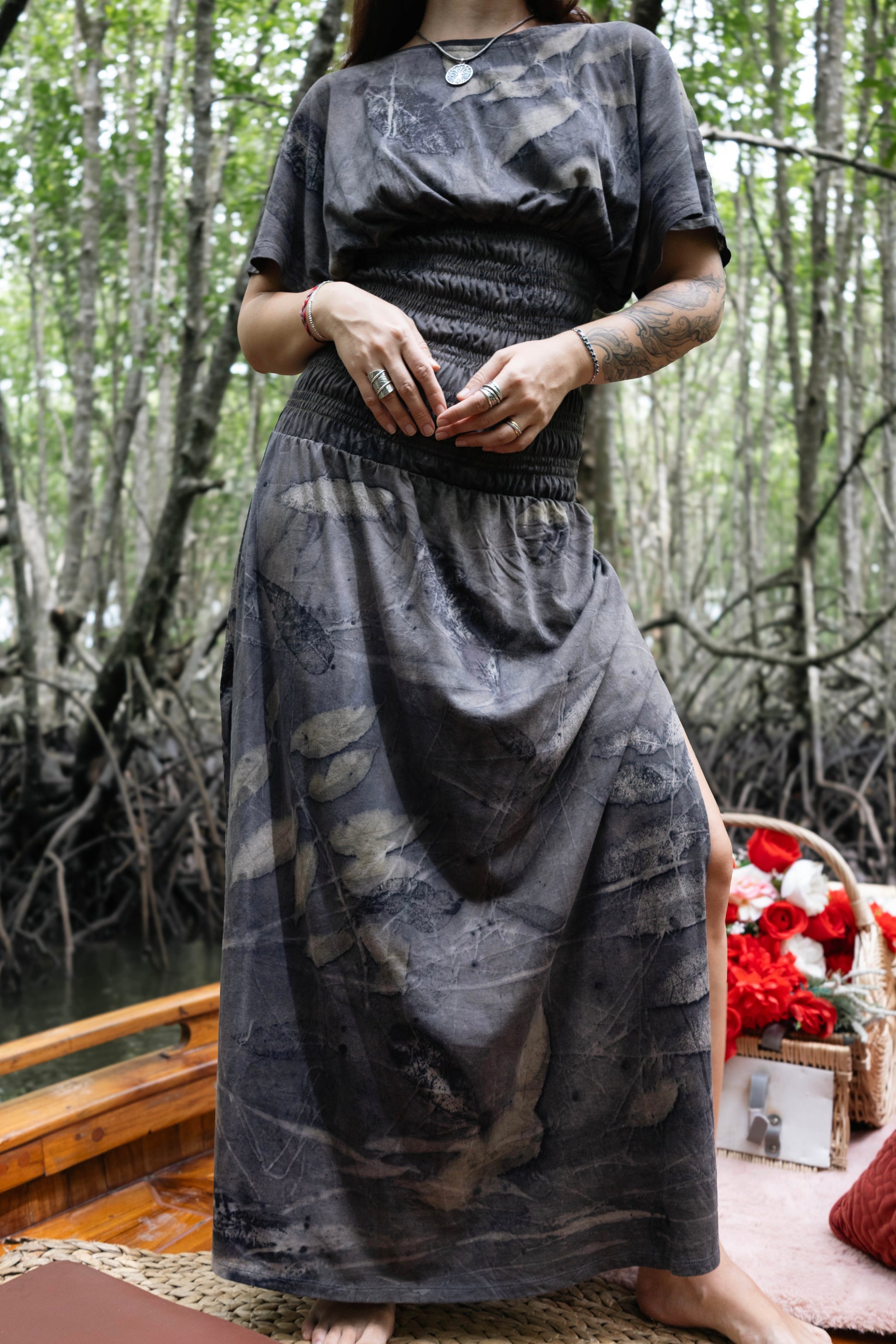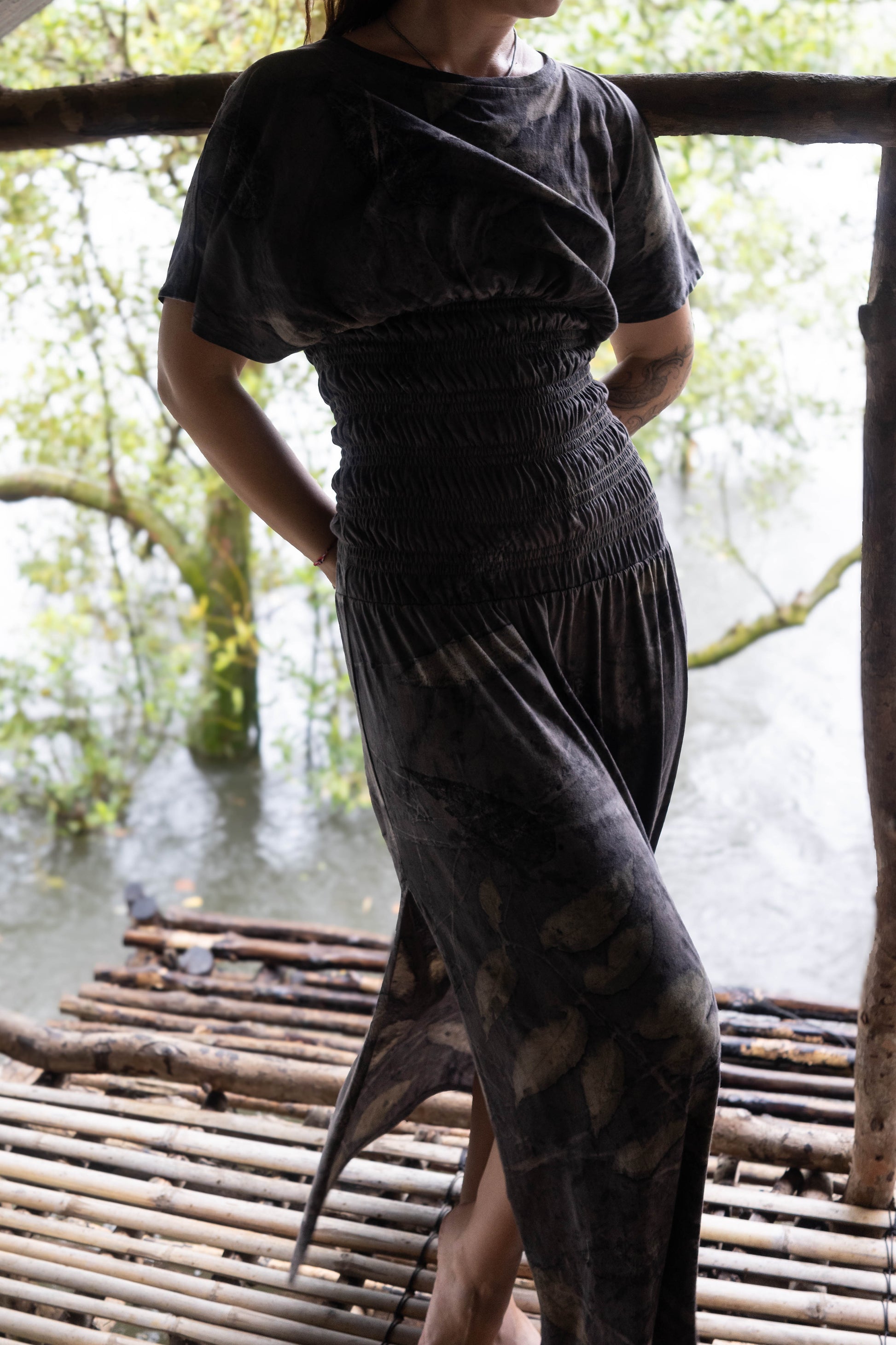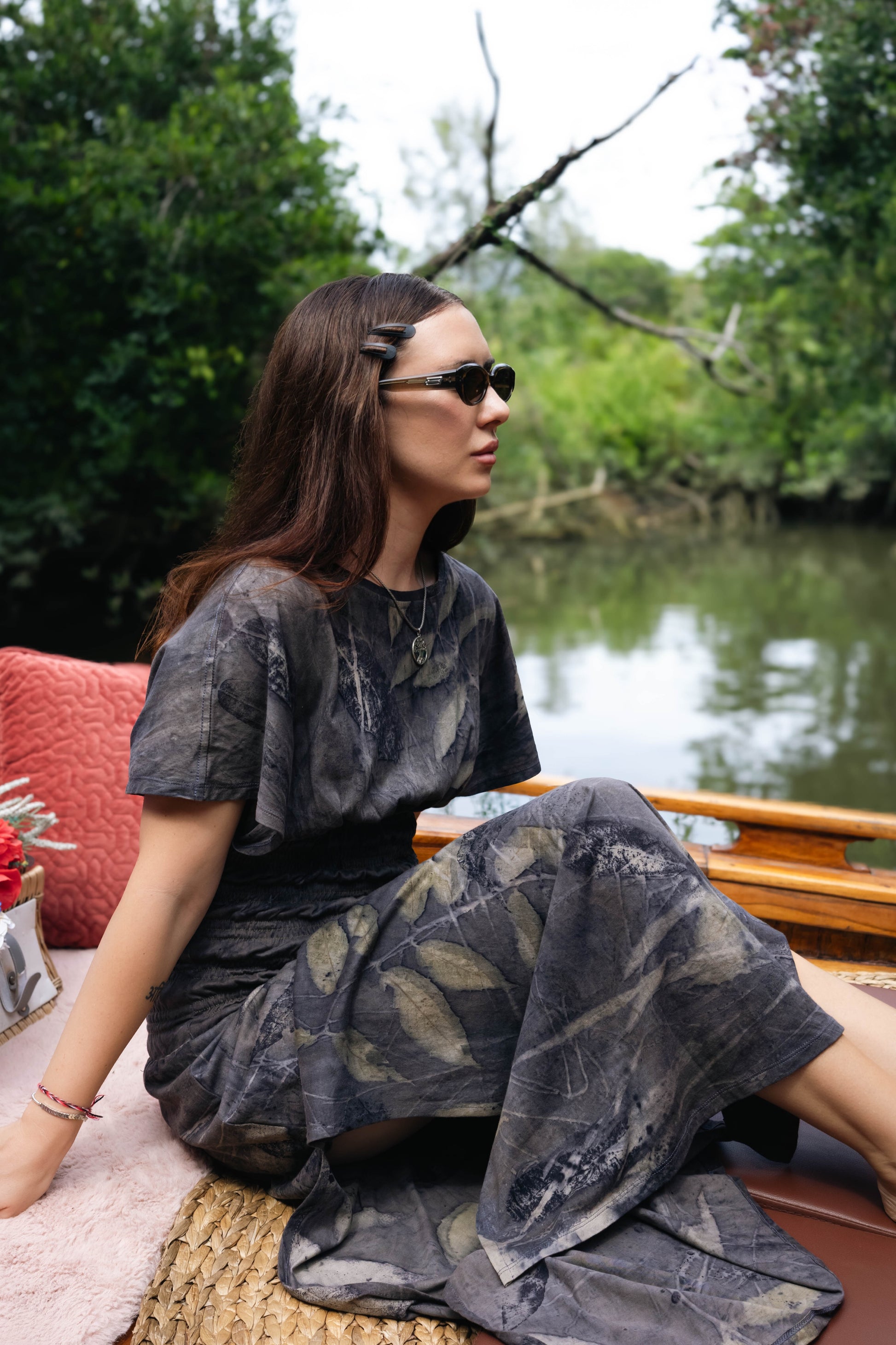 A one-of-a-kind piece made from breathable organic cotton, hand eco-printed with real leaves for naturally unique patterns.
